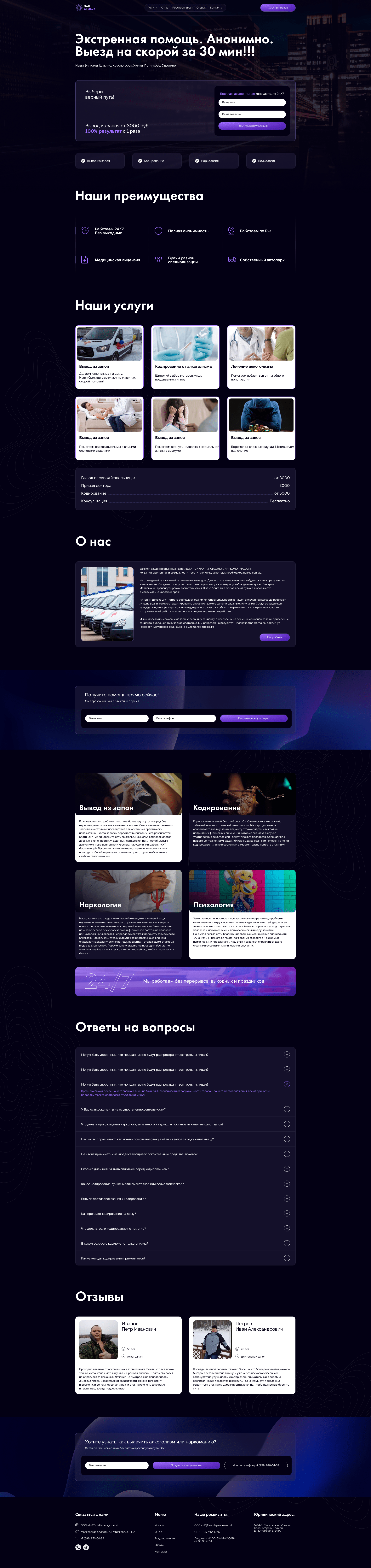 Цель: Наша задача заключалась в разработке современного и информативного веб-сайта для ПАН СРЫВ24. Основная цель – создать удобную платформу, которая предоставит пациентам и их родственникам доступ к полной информации об услугах клиники, методах лечения и условиях пребывания, а также поможет установить доверие к профессионализму сотрудников.