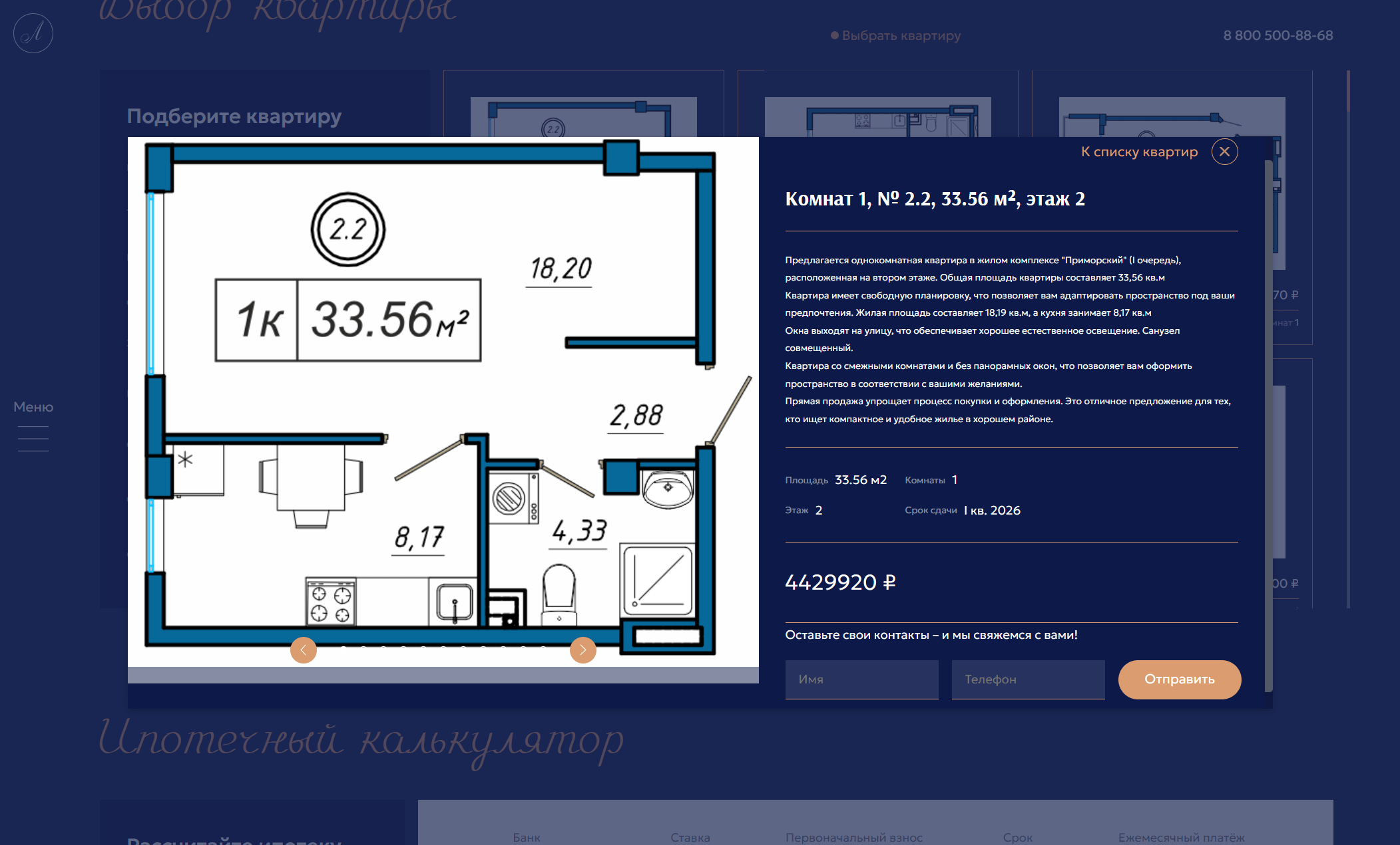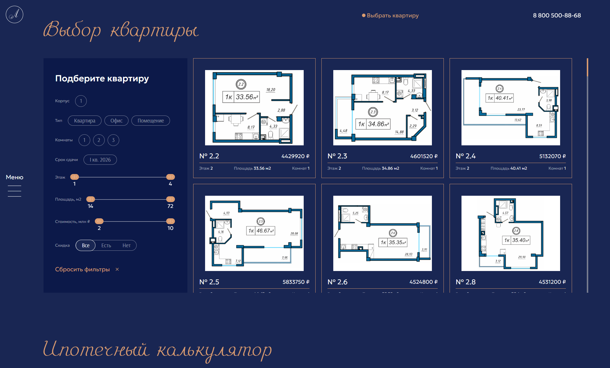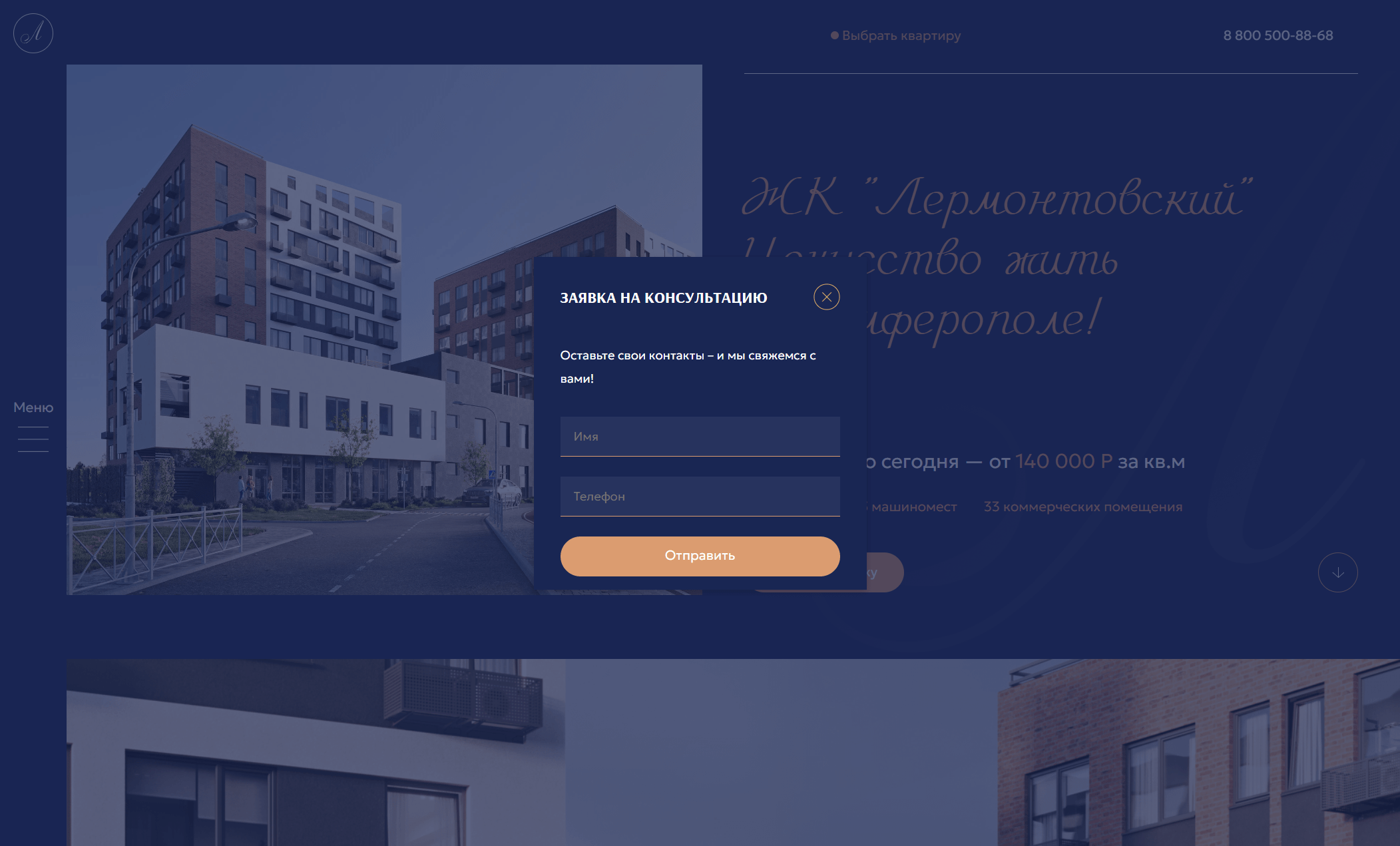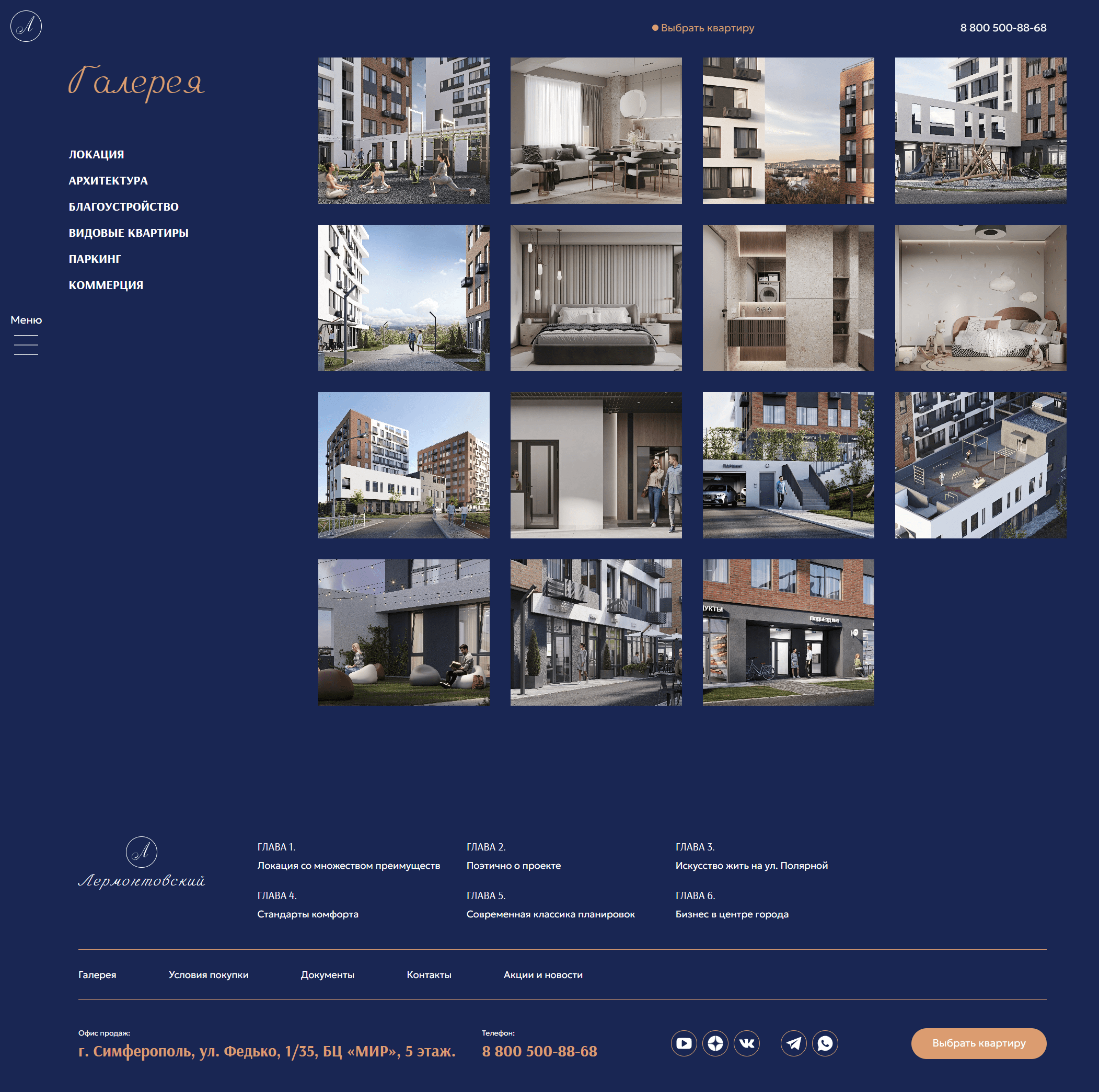 Цель: Создание стильного и функционального сайта для жилого комплекса "Лермонтовский", который подчеркивает ключевые преимущества объекта: удобное расположение, современная архитектура и комфортные условия для жизни. Основной задачей было представить ЖК "Лермонтовский" как идеальное место для проживания и привлечь потенциальных покупателей.