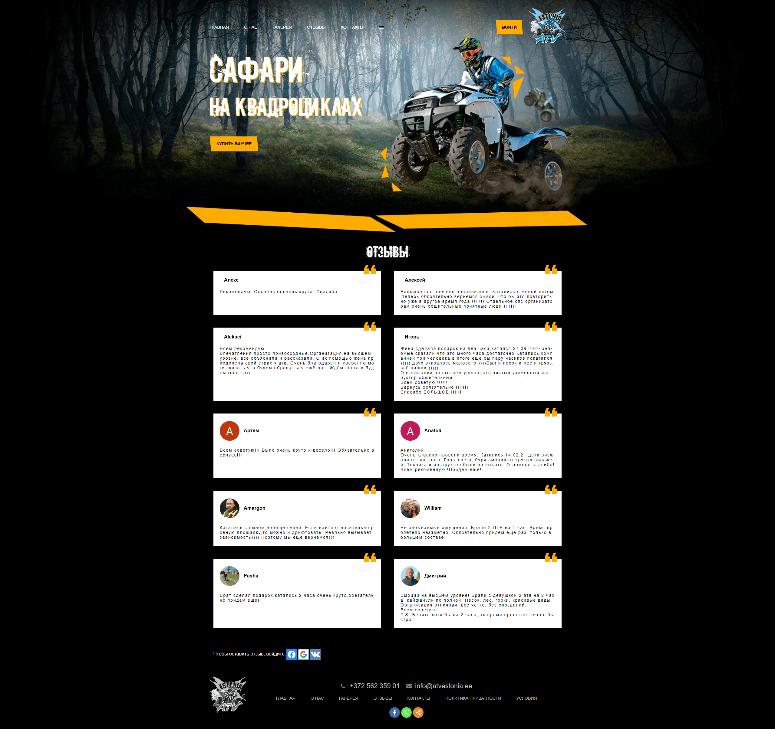 Результаты: В результате нашей работы компания, предоставляющая услуги сафари на квадроциклах, получила современный и функциональный веб-сайт, который стал важным инструментом для привлечения новых клиентов и поддержания связи с текущими. Веб-сайт получил положительные отзывы за свой захватывающий дизайн и удобство использования, что способствовало росту интереса и лояльности среди клиентов.