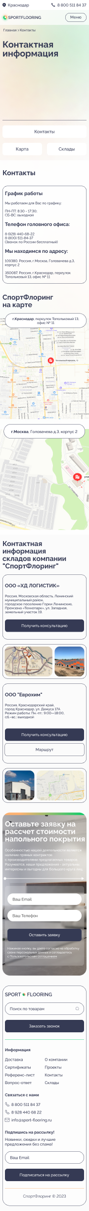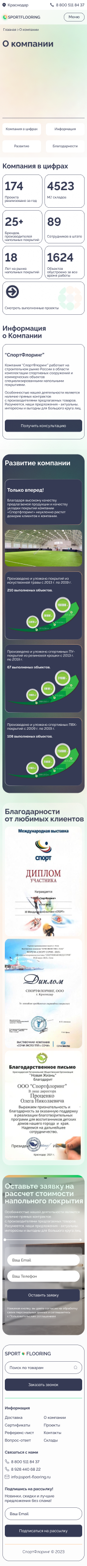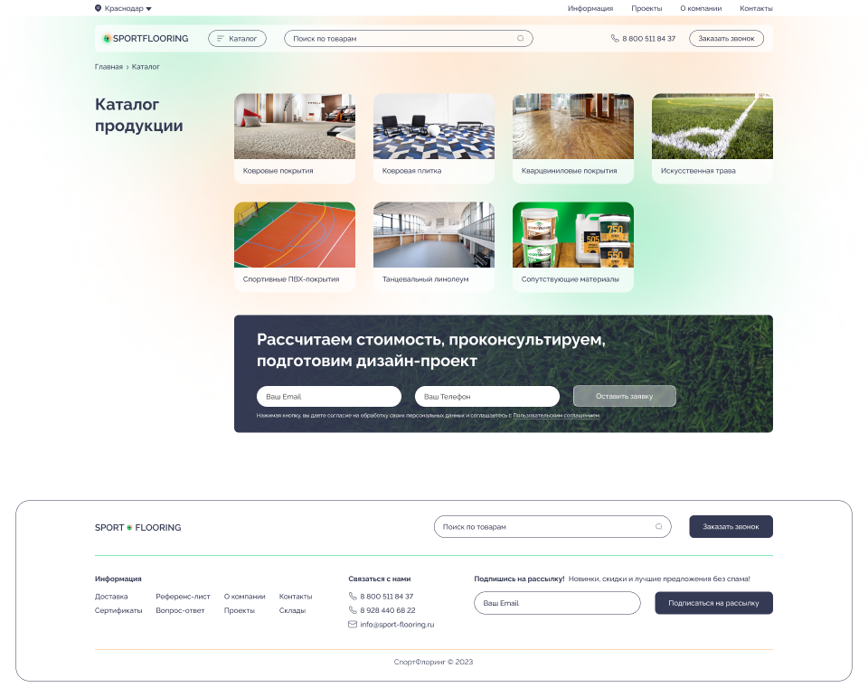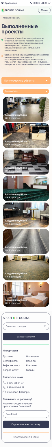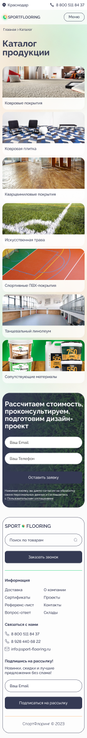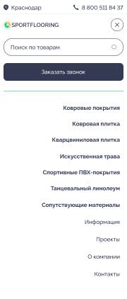 Решение: Мы разработали интуитивно понятный и стильный веб-сайт, который позволяет пользователям быстро и легко находить информацию о различных типах коммерческих и спортивных напольных покрытий, их характеристиках и преимуществах. Особое внимание было уделено удобству навигации и адаптивному дизайну, чтобы сайт отлично смотрелся и функционировал на любых устройствах, включая мобильные телефоны и планшеты.