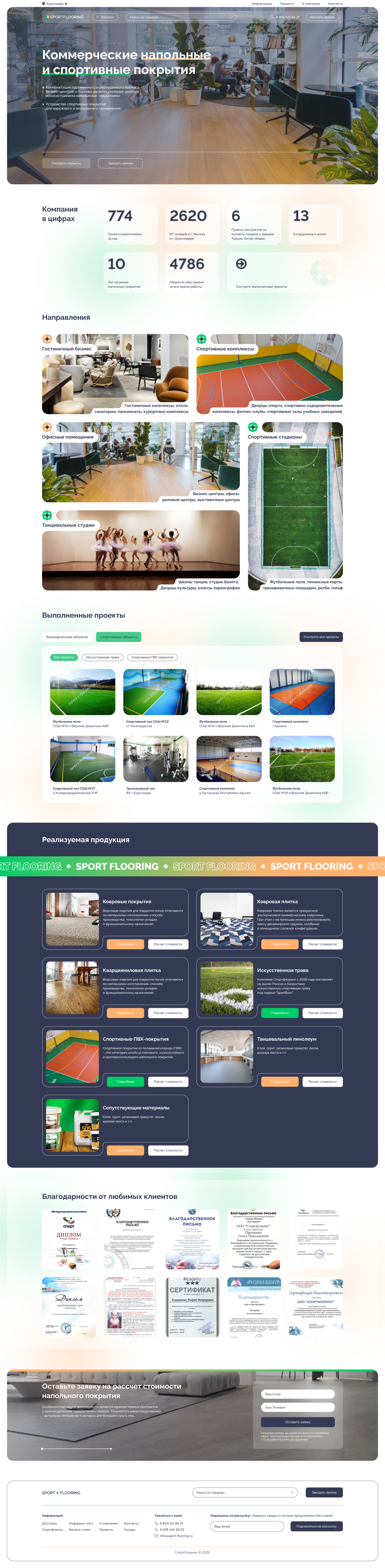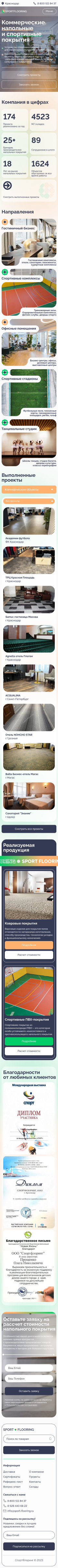 Результаты: В результате нашей работы компания SPORTFLOORING получила современный и функциональный веб-сайт, который стал важным инструментом для привлечения новых клиентов и поддержания связи с текущими. Веб-сайт получил положительные отзывы за свой дизайн и удобство использования, что способствовало росту доверия и лояльности среди клиентов.