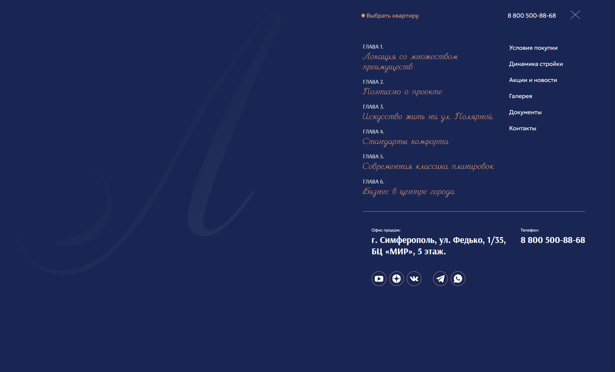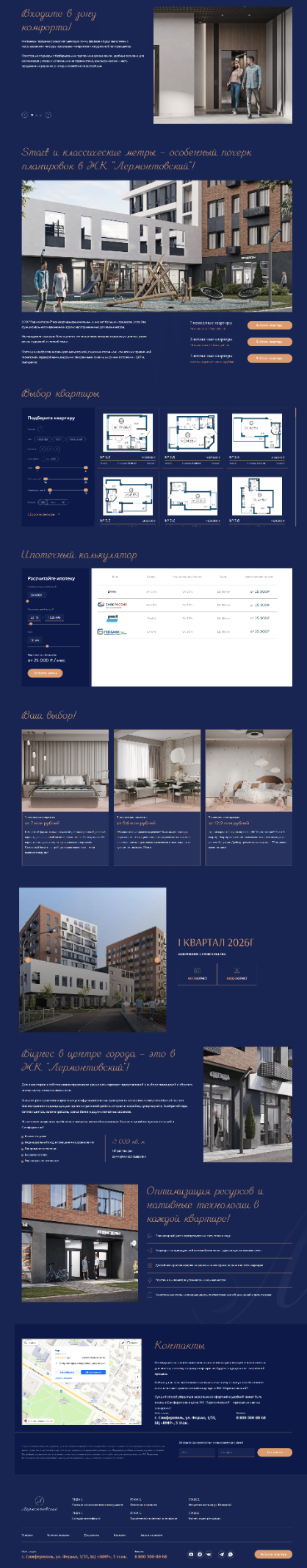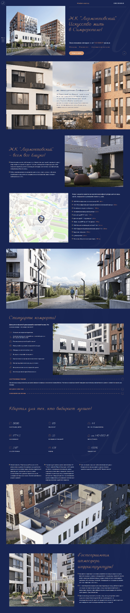 Цель: Создание стильного и функционального сайта для жилого комплекса "Лермонтовский", который подчеркивает ключевые преимущества объекта: удобное расположение, современная архитектура и комфортные условия для жизни. Основной задачей было представить ЖК "Лермонтовский" как идеальное место для проживания и привлечь потенциальных покупателей.