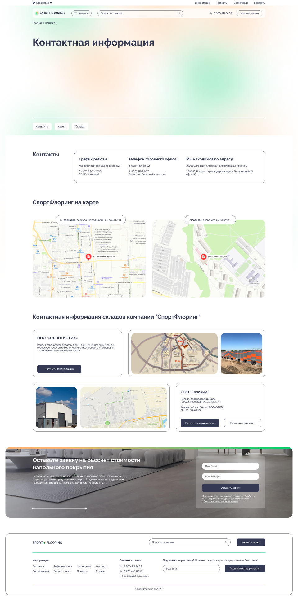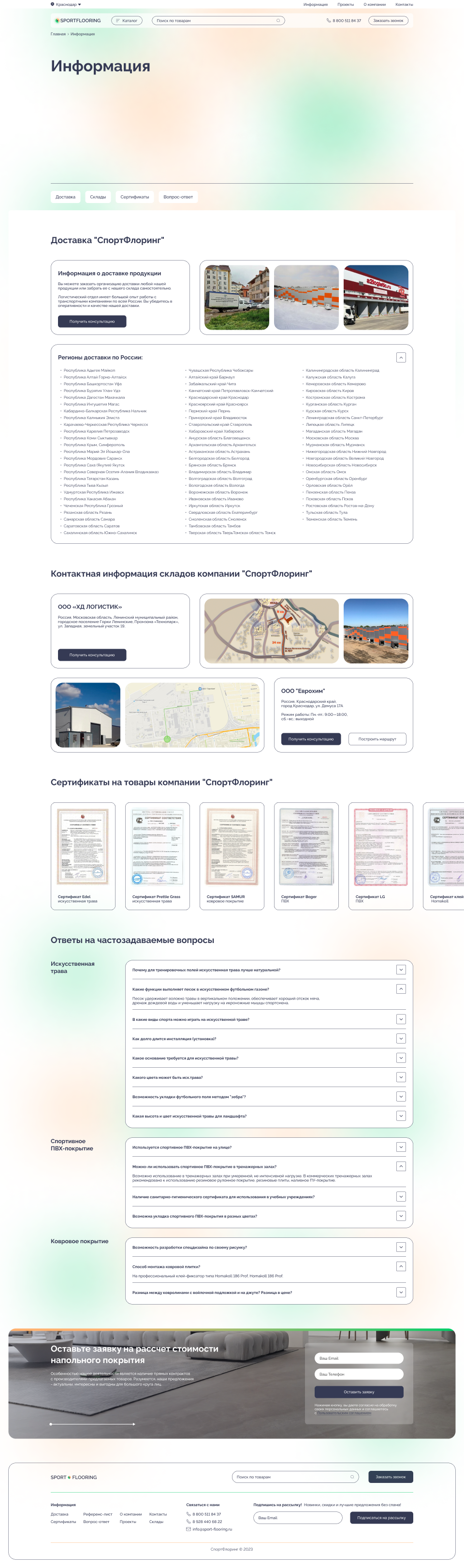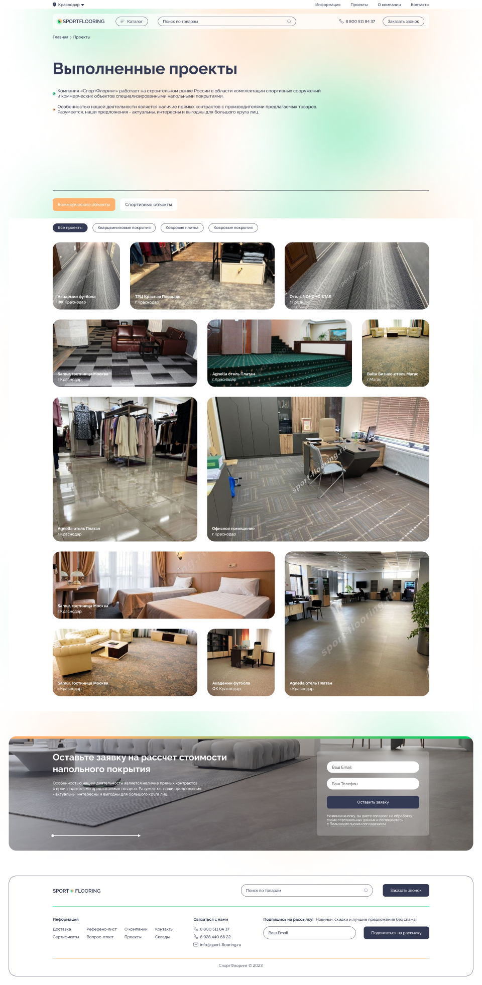 Решение: Мы разработали интуитивно понятный и стильный веб-сайт, который позволяет пользователям быстро и легко находить информацию о различных типах коммерческих и спортивных напольных покрытий, их характеристиках и преимуществах. Особое внимание было уделено удобству навигации и адаптивному дизайну, чтобы сайт отлично смотрелся и функционировал на любых устройствах, включая мобильные телефоны и планшеты.