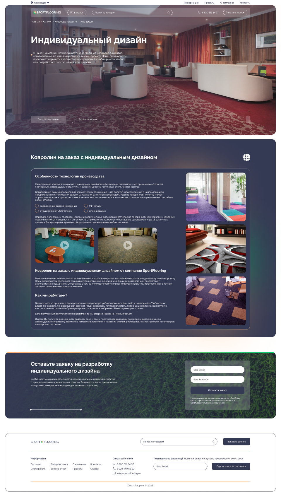 Цель: Наше диджитал агентство сотрудничало с компанией SPORTFLOORING, специализирующейся на коммерческих и спортивных напольных покрытиях, для создания современного и удобного веб-сайта. Наша цель заключалась в том, чтобы разработать онлайн-платформу, которая бы помогала клиентам легко находить информацию о предоставляемых продуктах и услугах, а также отражала высокий уровень профессионализма и качества компании.